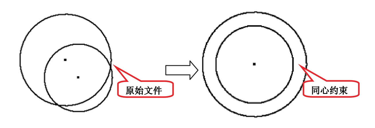 可将两段圆弧、两个圆或椭圆约束为具有相同的中心点,其结果与在曲线的中心点上应用重合约束是完全相同的。使用该约束工具时分别用鼠标选取两个或多个要施加约束的几何图元即可创建重合约束。需要注意的是,添加约束后的几何图元的位置由所选的第一条曲线来设置中心点,未添加其他约束的曲线被重置为与已约束曲线同心,其结果与应用到中心点的重合约束是相同的。