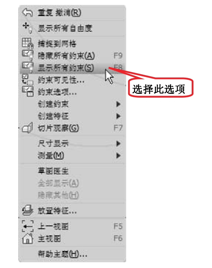在给草图添加几何约束以后,默认情况下这些约束是不显示的,但是用户可自行设定是否显示约束。如果要显示全部约束的话,可在草图绘制区域内单击鼠标右键,在如图3-74所示的快捷菜单中选择“显示所有约束”选项;相反如果要隐藏全部的约束,在快捷菜单中选择“隐藏所有约束”选项即可。