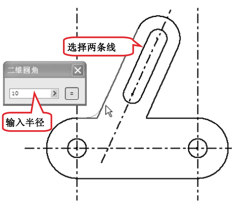 ,打开如图3-90所示的“二维圆角”对话框,输入半径为10,选择如图3-90所示的两条线,单击完成圆角;输入半径为2,选择如图3-91所示的两条边线,单击完成圆角,如图3-92所示。