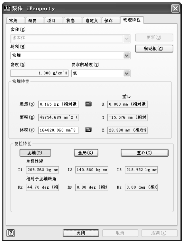 三维CAD技术具有根据产品几何模型计算相应物体的体积、表面积、质量、密度、重心、导线长度以及轴的转动惯量和回转半径等几何特性的能力,为系统对产品进行工程分析和数值计算提供必要的基本参数和数据。图1-4是利用Autodesk公司的三维CAD软件Autodesk Inventor所计算出的零件模型的物理特性。
