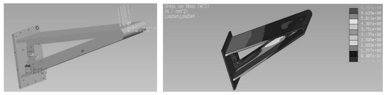 三维CAD技术具有结构分析、运动学分析和温度分析等有限元分析功能,它具有一个机械机构的静态分析、模态分析、屈曲分析、振动分析、运动学分析、动力学分析、干涉分析、瞬态温度分析等功能,即具有对机构进行分析和仿真等研究能力,从而为设计师在设计运动机构时,提供直观的、可仿真的交互式设计技术。图1-5是PTC公司的CAD产品CREO对构件应力的分析结果。