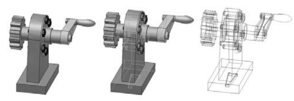三维CAD技术具有动态显示图形、消除隐藏线,色彩浓淡处理的能力,以便使设计师通过视觉直接观察、构思和检验产品模型,解决了三维几何模型在设计复杂空间布局的问题。图1-6是Autodesk公司的三维CAD产品Inventor中的三种不同的模型显示方式。