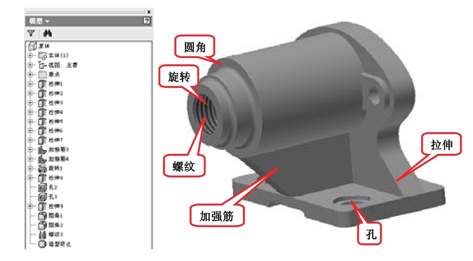 (1)基于特征。基于特征是指在参数化造型环境中,零件是由特征组成的,所以参数化造型也可成为基于特征的造型。参数化造型系统可把零件的结构特征十分直观地表达出来,因为零件本身就是特征的集合。图1-9是用Autodesk公司的Inventor软件做的零件图,左图是零件的浏览器,显示这个零件的所有特征。浏览器中的特征是按照特征的生成顺序排列的,最先生成的特征排在浏览器的最上面,这样模型的构建过程就一目了然了。