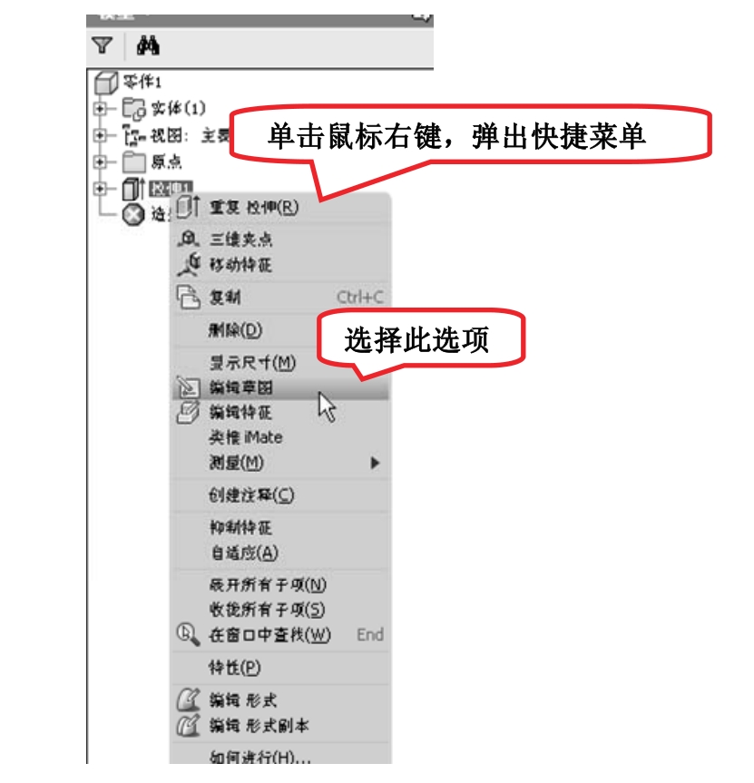 如果要在一个现有的零件图中进入草图环境,首先应该找到属于某个特征的曾经存在的草图(也叫退化的草图),选择该草图,单击鼠标右键,在弹出的快捷菜单中选择“编辑草图”选项即可重新进入草图环境,如图1-15所示。当编辑某个特征的草图时,该特征会消失。