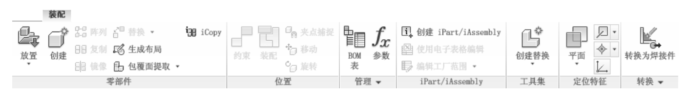装配环境由菜单栏、快捷工具栏、功能区(上部)、浏览器(左部)以及绘图区域等组成。部件(装配)功能区如图1-20所示。图1-21是一个部件及其浏览器,从浏览器上可以看出,部件是零件和子部件以及装配关系的组合。