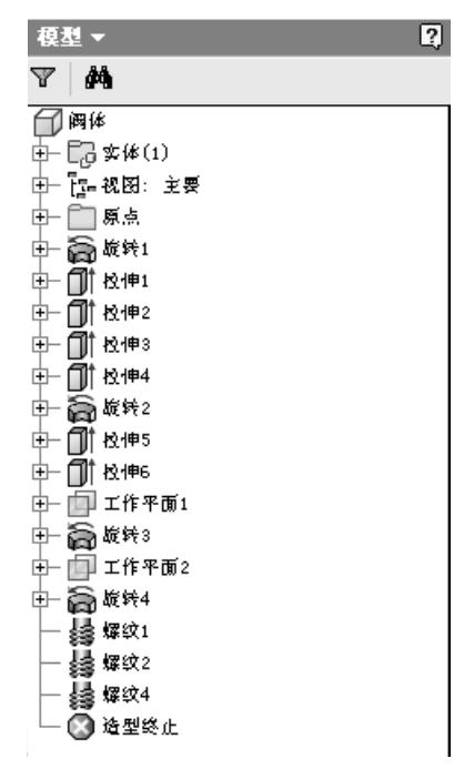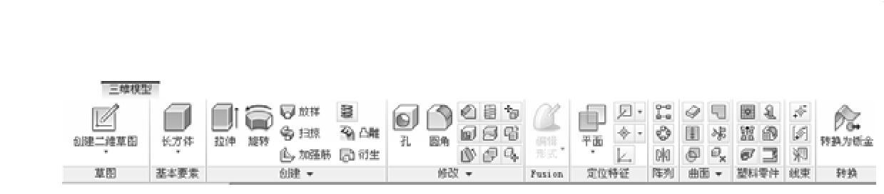 模型环境下的工作界面由菜单栏、快速工具栏、功能区(上部)、浏览器(左部)以及绘图区域等组成。模型功能区如图1-17所示。零件的浏览器如图1-18所示,从浏览器中可清楚地看到零件是特征的组合。