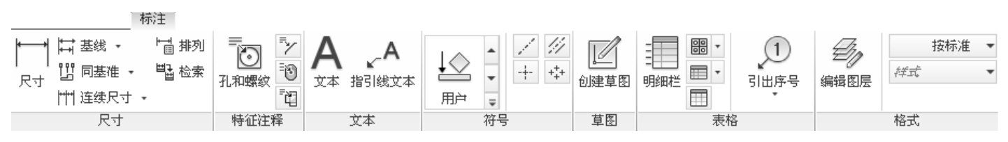 工程图环境由菜单栏、快速工具栏、工程图视图功能区和浏览器(左部)以及绘图区域等组成。工程图视图功能区如图1-25所示,工程图标注功能区如图1-26所示。