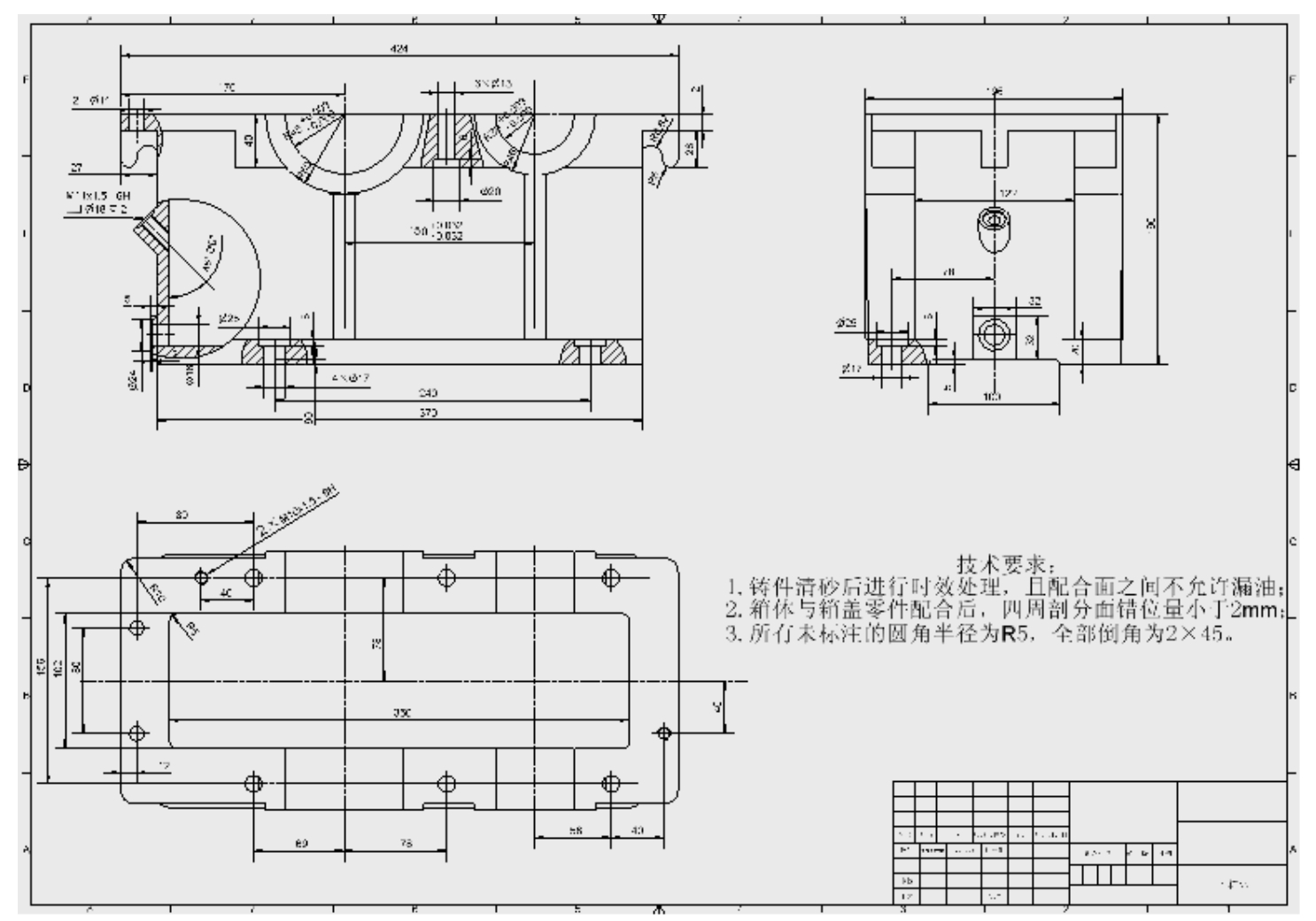 利用工程图视图功能区可生成各种需要的二维视图,如基础视图、投影视图、斜视图、剖视图等。利用工程图标注功能区可对生成的二维视图进行尺寸标注、公差标注、基准标注、表面粗糙度标注以及生成部件的明细表等。图1-27是一幅完成的零件工程图。
