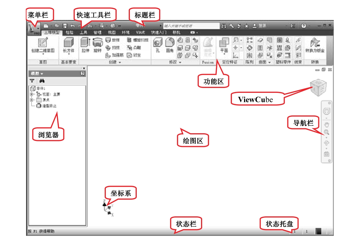 工作界面包括菜单栏、快速工具栏、功能区、浏览器、ViewCube、导航栏和状态栏,如图1-10所示。