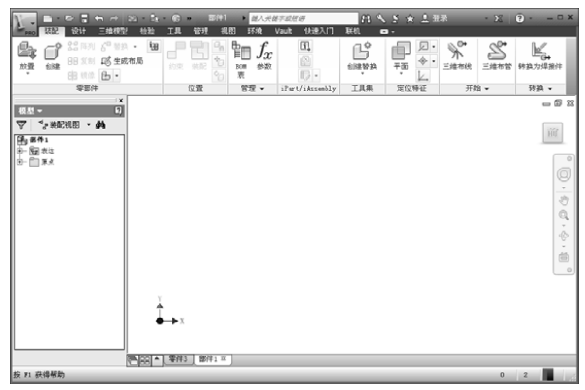 在Inventor中,部件是零件和子部件的集合。在Inventor 中创建或打开部件文件时,也就进入了部件环境(也叫做装配环境)。在“新建文件”对话框中选择“Standard.iam”选项,就会进入部件环境,如图1-19所示。