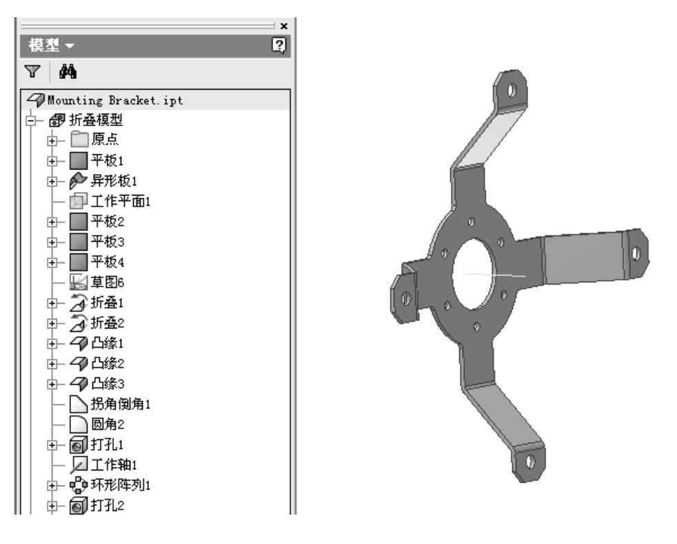 ,就进入了钣金零件环境,如图1-22所示。钣金零件环境由菜单栏、快速工具栏、钣金特征功能区(上部)、浏览器(左部)以及绘图区域等组成。在钣金特征功能区上单击鼠标右键,在打开的快捷菜单中选择“将图标与文本一同显示”选项,则钣金特征功能区如图1-23所示,可看到关于工具的提示信息已经隐藏。图1-23是一个钣金零件及其浏览器,从浏览器上可以看出,钣金零件是钣金特征的组合。