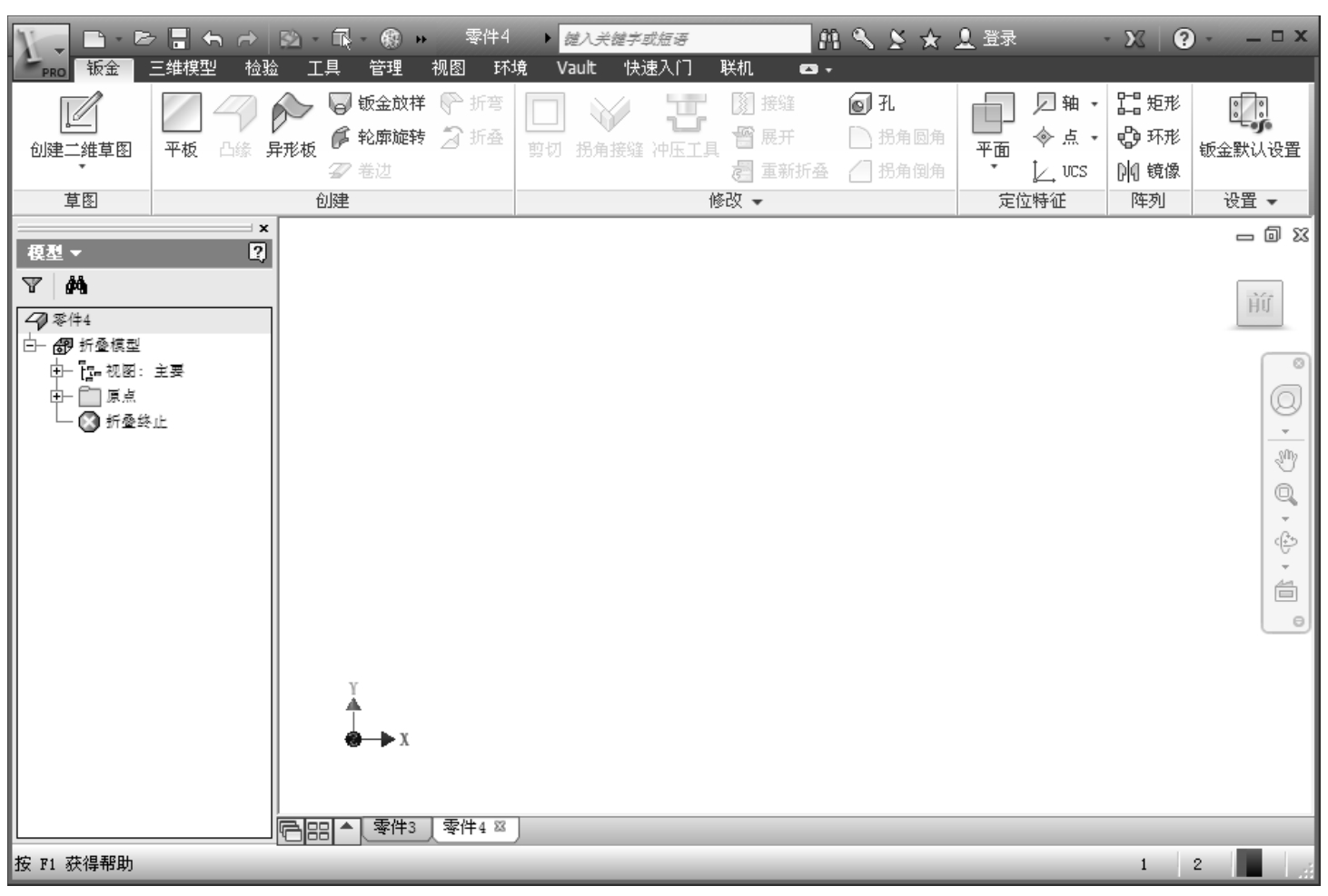 在“新建文件”对话框中选择Sheet Metal.ipt选项,就会进入到钣金环境中。可看到钣金环境和零件环境一样,单击“创建二维草图”进入草图环境,绘制完毕后单击“草图”功能区中的“完成草图”选项