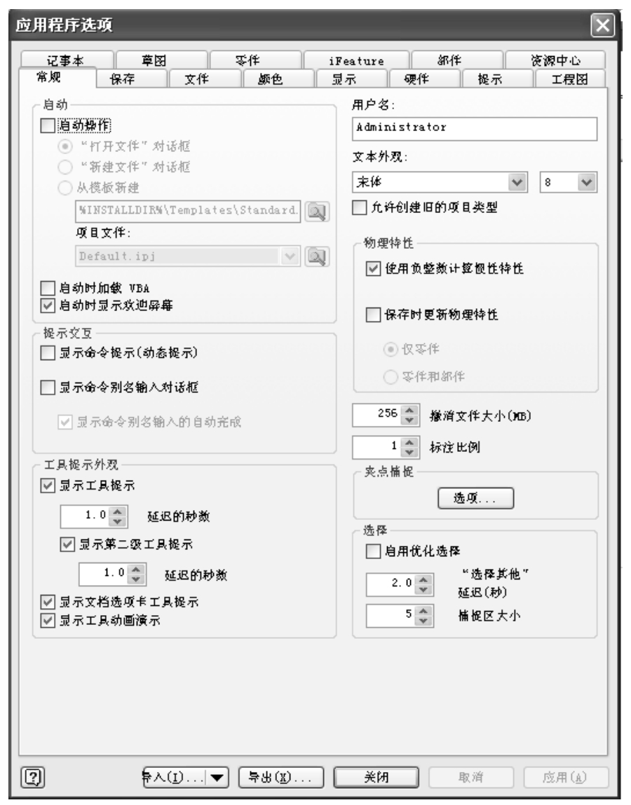 可通过设置“撤销文件大小”选项的值来设置撤销文件的大小,即用来跟踪模型或工程图改变临时文件的大小,以便撤销所做的操作。当制作大型或复杂模型和工程图时,可能需要增加该文件的大小,以便提供足够的撤销操作容量,文件大小以“MB”为单位输入大小。