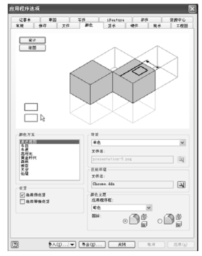 Inventor 2013中提供了九种配色方案,当选择某一种方案时,上面的预览窗口会显示该方案的预览图。