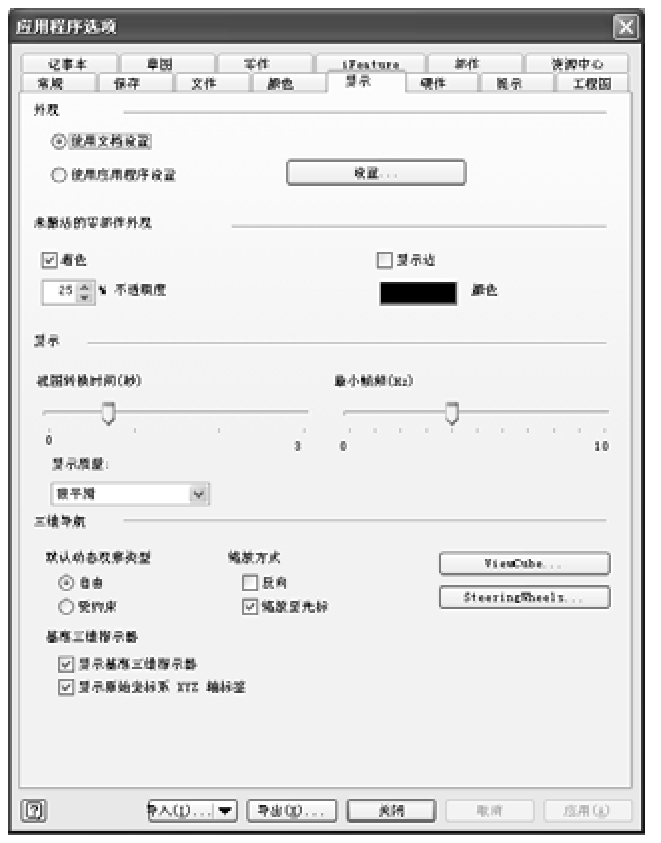 执行上述操作后,打开“应用程序选项”对话框,在对话框中选择“显示”选项卡,如图1-33所示。下面讲述一下模型的线框显示方式、渲染显示方式以及显示质量的设置。