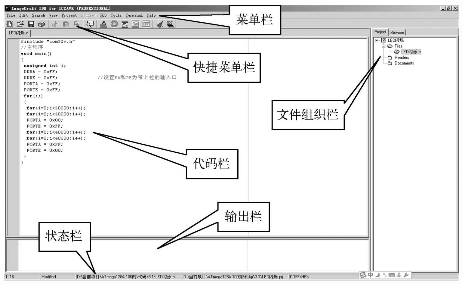 图2.6所示为ICCAVR的运行界面,可以分为菜单栏、快捷菜单栏、代码栏、输出栏、文件组织栏和状态栏等部分。