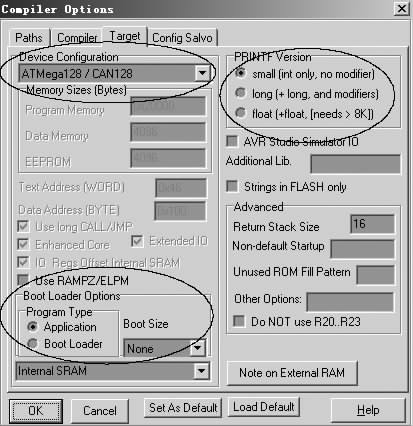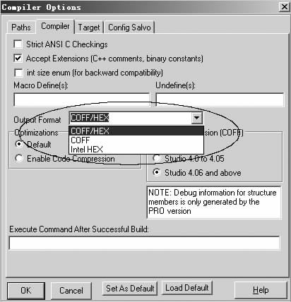 “Compiler”标签页常用的设置是选择项目的“Output Fomat”方式,通常情况下选择“COFF/HEX”即可,该选择生成项目对应的.COFF文件和.HEX文件,前者用于调试,后者用于对ATmega128编程。