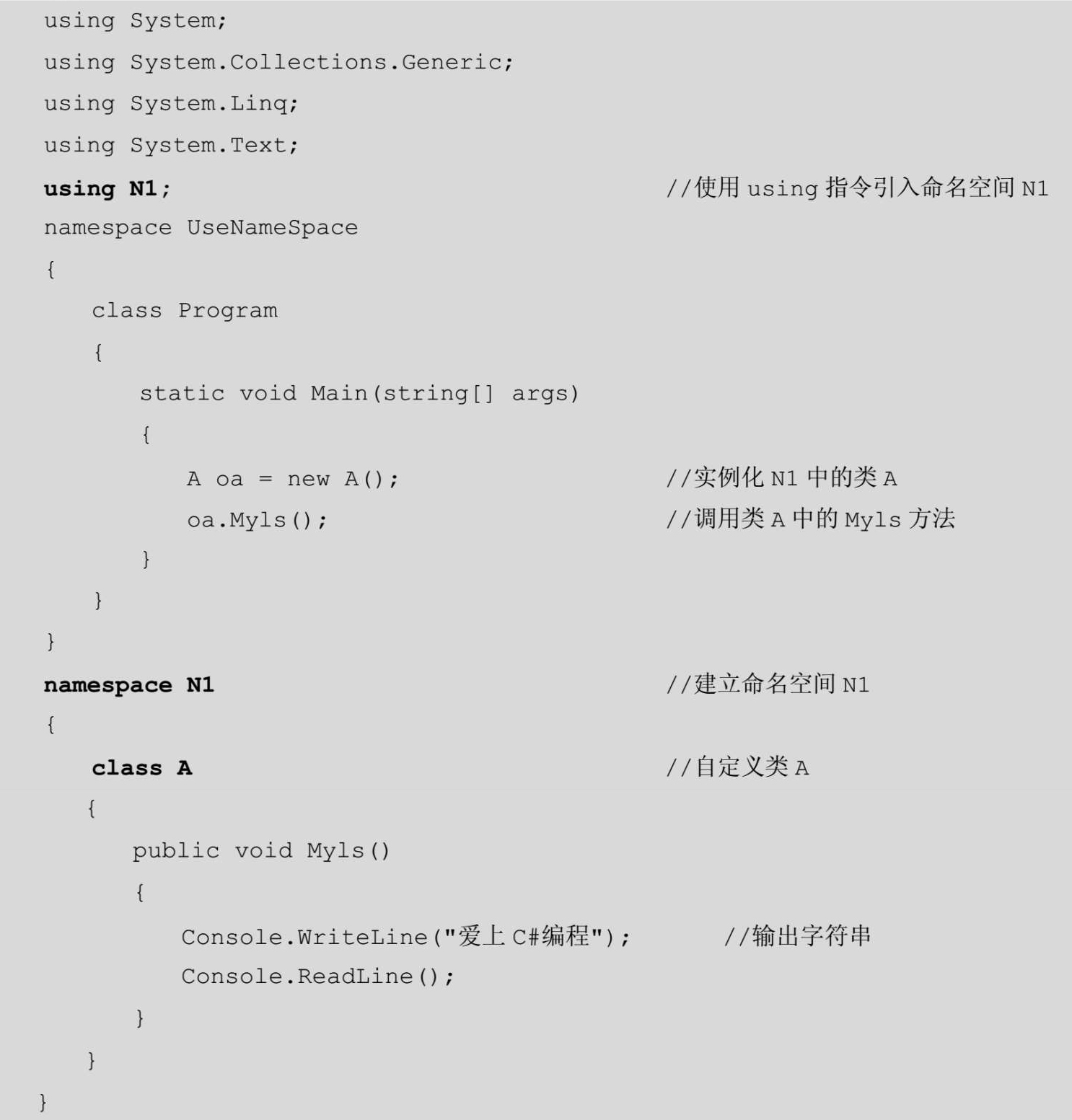 【例3.2】 创建一一个控制台应用程序,在其主程序文件Program.cs中建立一一个命名空间N1,在命名空间N1中自定义一一个类A,在项目中使用using指令引入命名空间N1,然后在命名空间UseNameSpace中便可以实例化命名空间N1中的类,然后调用此类中的Myls方法。代码如下:
