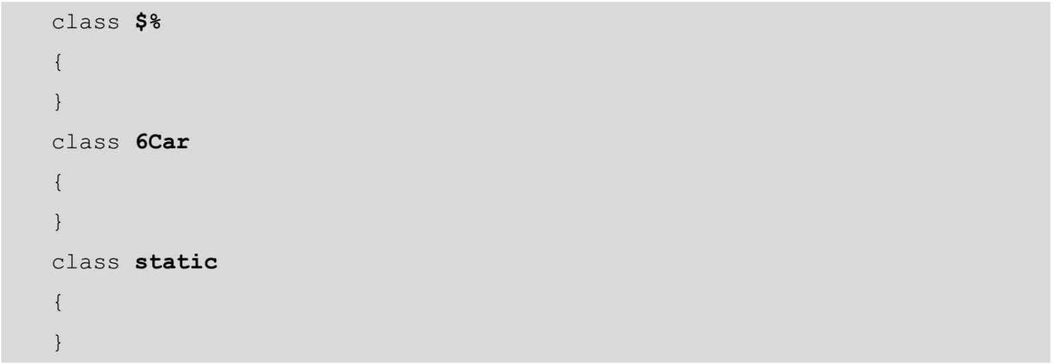 例如,下面定义的类名就是错误的,因为第一个和第二个类名称不符合标识符的基本要求,而第三个类名称“static”是表示静态概念的关键字(static常用来修饰方法或类),所以都不可以作为类名。