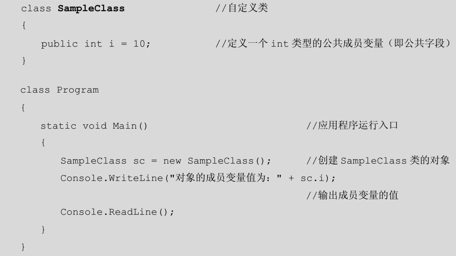 【例3.10】 创建一一个控制台应用程序,在其中创建一一个类SampleClass,在此类中声明一一个int类型的变量,并初始化为10,然后在程序的其他位置通过new关键字创建此类的引用类型变量进行使用,最后输出引用变量的值。代码如下: