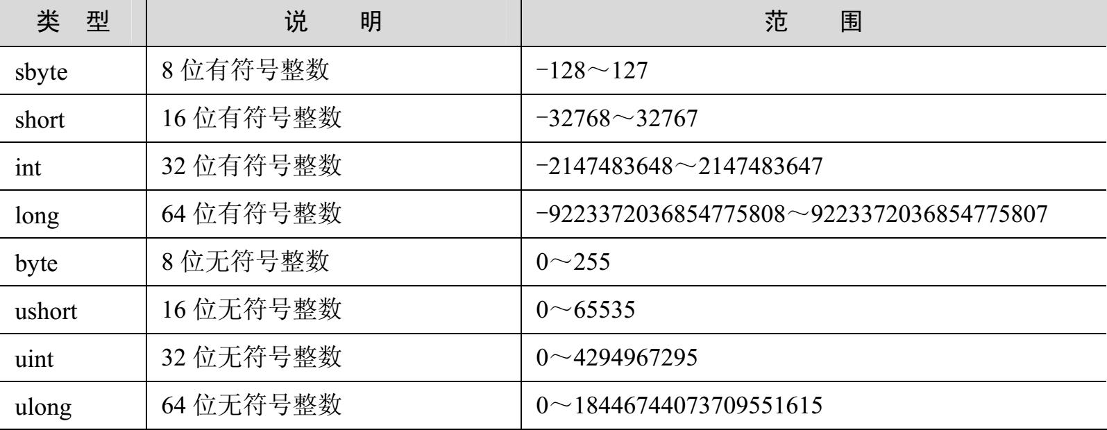 整数类型代表一种没有小数点的整数数值,在C#中内置的整数类型如表3.1所示。