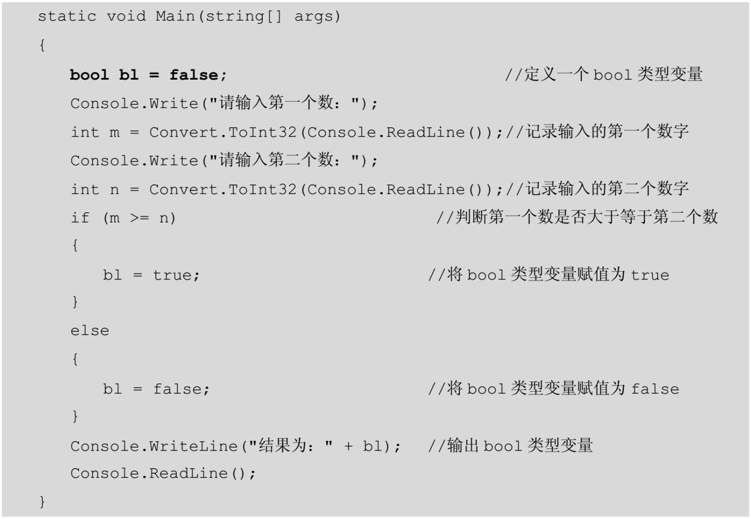 【例3.9】 创建一一个控制台应用程序,在其中声明一一个bool类型的变量bl,并初始化为false;然后在控制台中输入两个数,并通过比较两个数的大小来重新为bool类型的变量赋值;最后输出bool类型变量的值。代码如下:
