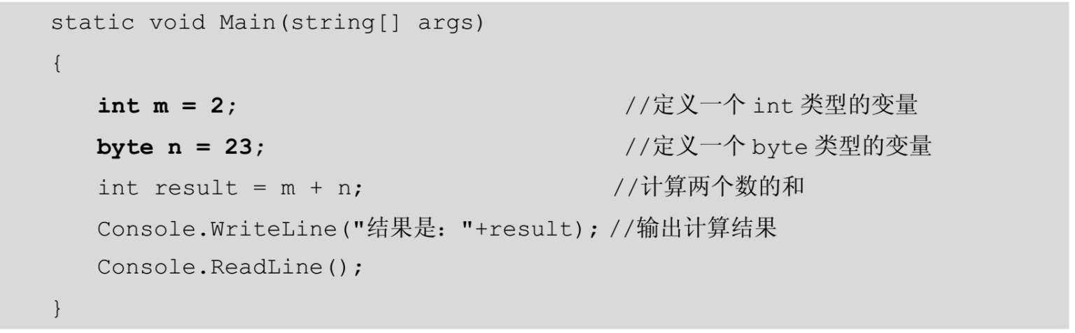 【例3.6】 创建一一个控制台应用程序,在其中声明一一个int类型的变量m,并初始化为2;声明一一个byte类型的变量n,并初始化为23;然后计算定义的两个变量的和,并进行输出。代码如下: