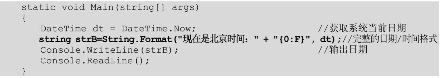 【例5.13】 创建一一个控制台应用程序,声明一一个DateTime类型的变量dt,用于获取系统的当前日期时间,然后通过使用格式规范F将日期时间格式化为“YYYY年MM月dd日 hh:mm:ss”的格式。代码如下: