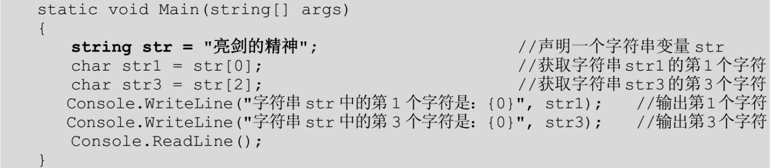 【例5.7】 创建一一个控制台应用程序,声明一一个字符串变量,然后获取字符串中的某个字符,代码如下: