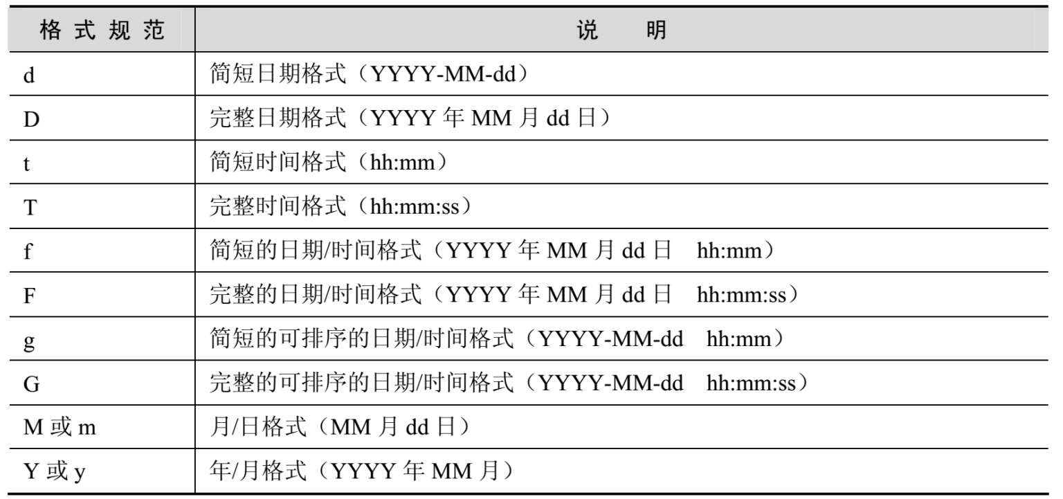 如果希望日期时间按照某种格式输出,那么可以使用Format方法将日期时间格式化成指定的格式。在C#中,已经提供了一些用于日期时间的格式规范,具体描述如表5.3所示。