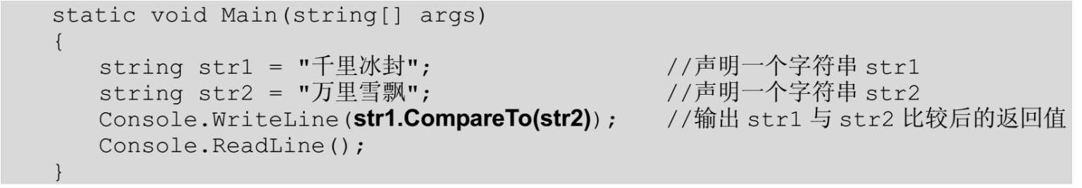 【例5.10】 创建一一个控制台应用程序,使用CompareTo方法比较两个字符串,代码如下: