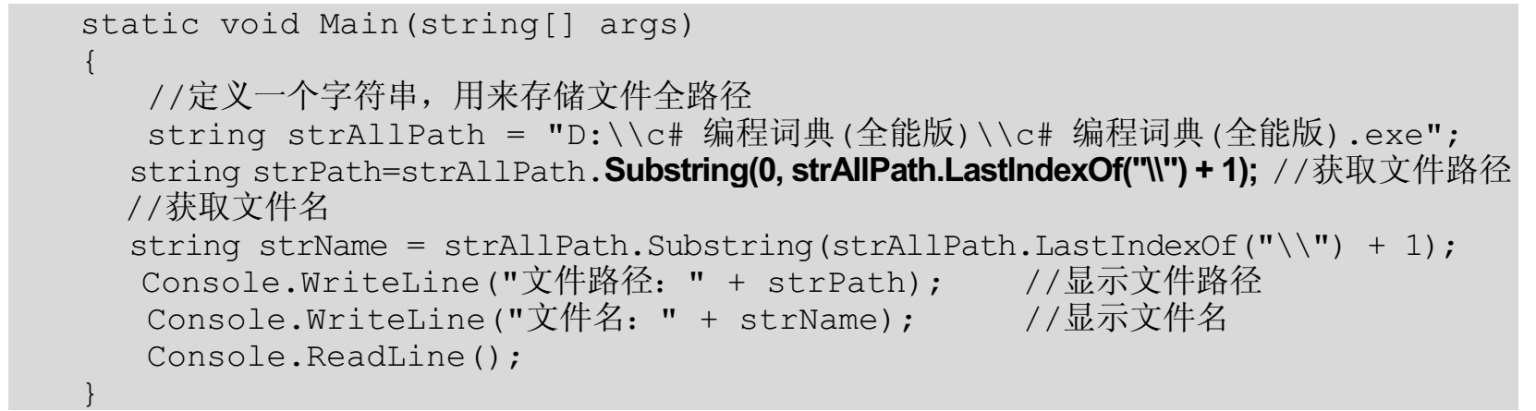 【例5.15】 创建一一个控制台应用程序,声明一一个字符串类型的变量,用来存储一一个文件的全路径;然后使用String类的Substring方法从该全路径中分别截取文件的名称及路径。代码如下: