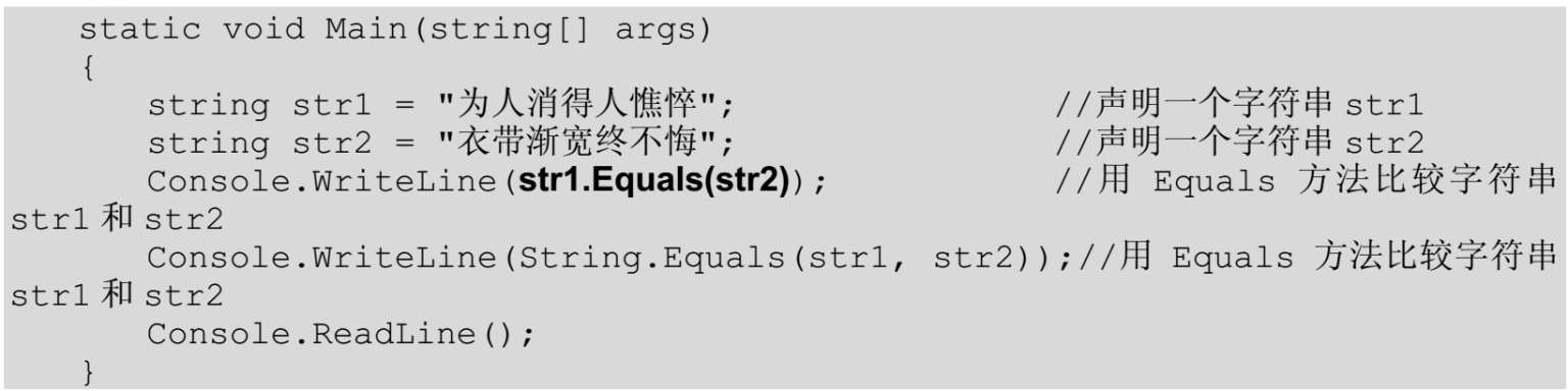 【例5.11】 创建一一个控制台应用程序,声明两个字符串变量,然后使用Equals方法比较两个字符串是否相同,代码如下: