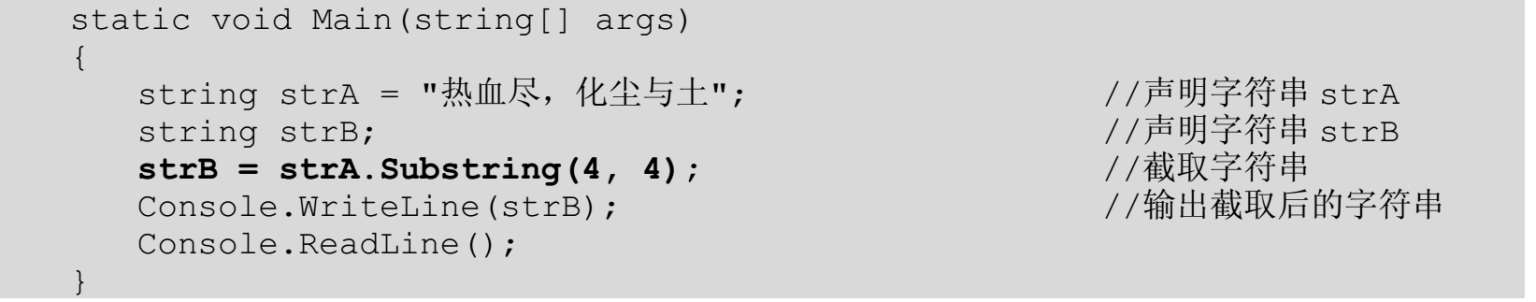 【例5.14】 创建一一个控制台应用程序,声明两个string类型的变量strA和strB,并将strA初始化为“热血尽,化尘与土”,然后使用Substring方法从索引4开始截取4个字符,赋值给strB,并输出strB。代码如下:
