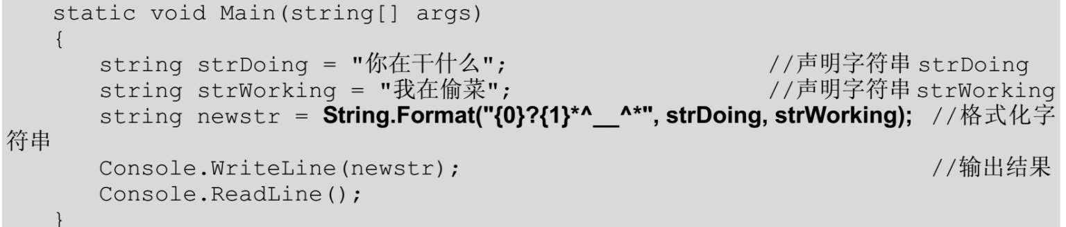 【例5.12】 创建一一个控制台应用程序,声明两个string类型的变量strDoing和strWorking,然后使用Format方法格式化这两个string类型变量,最后输出格式化后的字符串。代码如下: