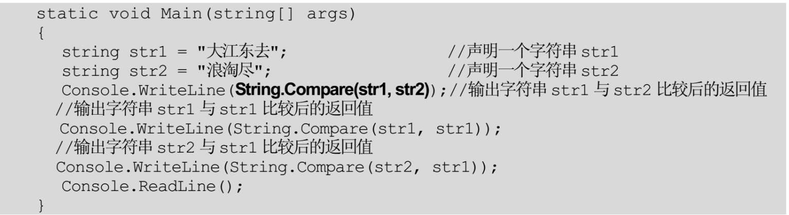 【例5.8】 创建一一个控制台应用程序,声明两个字符串变量,然后使用Compare方法比较两个字符串是否相等,代码如下: