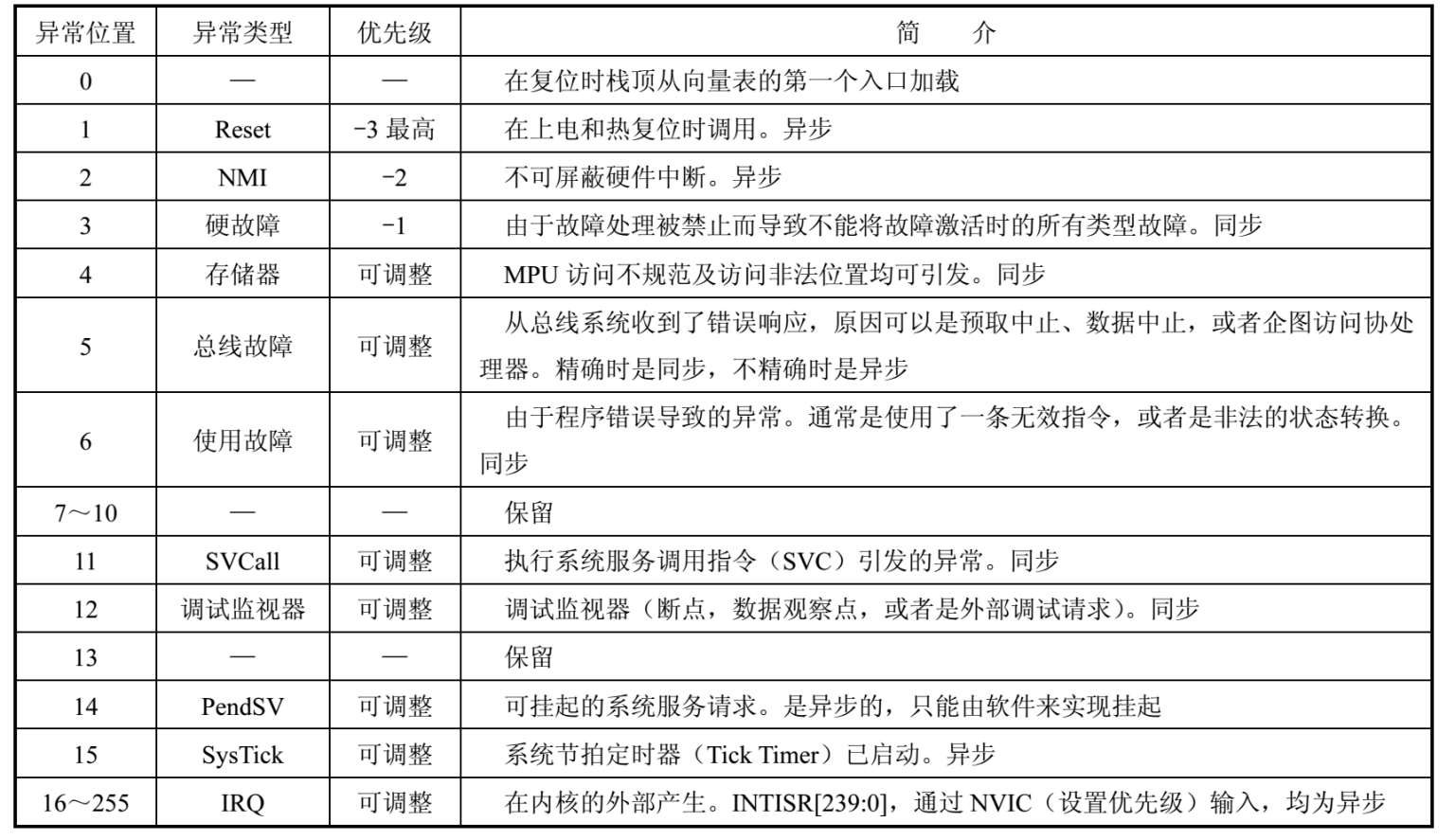 Cortex-M3支持大量异常,包括固定数量的系统异常和最多240个外部中断——通常称为IRQ。具体使用了这240个中断源中的多少个,由芯片制造商决定。除了Sys Tick之外,由外设产生的中断信号,全连接到NVIC的中断输入信号线。表2.4列出了Cortex-M3可以支持的所有异常。