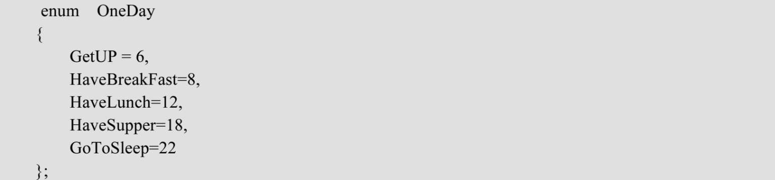 这样定义了一个一天中日常作息时间表,例如,有变量作为时间,当要验证该时间是否需要吃午饭时,只需要该变量和HaveLunch作比较,若相等,则该吃午饭了,若不等,则不吃午饭。这样设置将很容易使程序阅读者理解程序设置的功能。