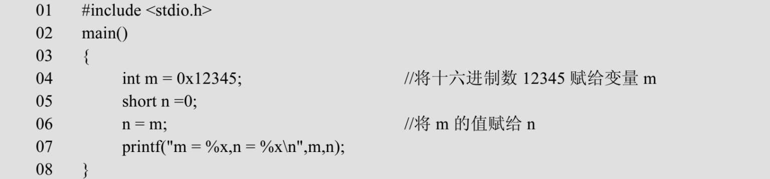 程序第 4 行定义了变量m并赋初值 0x12345,第 5 行定义了short型变量n并赋初值 0,程序第 6 行将m的值赋给n,由于n是short型变量,m是int型变量,所以n不能正确获取m的值。
