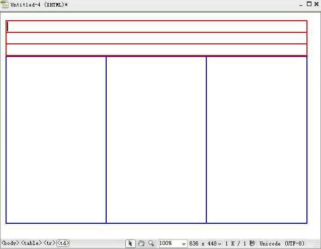 “从上到下”指的是观察表格的整体结构,看最外部的表格上下的并列关系,分析有几个表格并列,同时每个表格拆分成多少行。仔细观察效果图,你能发现从上到下一共有3个表格并列,最上面的表格是一个2行1列的表格,用来放置顶部的图片和导航文字;中间的表格是一个1行1列的表格,用来放置中间的所有内容;最下方也是一个1行1列的表格,用来放置版权信息。