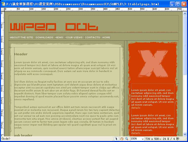 网页是如何使用表格来进行排版布局的呢?我们可以把网页想象成一个大表格,当你需要在网页中的某一个位置放置文字或者图片的时候,就可以在相应的位置拆分一个单元格,放置你需要的内容。当然这只是希望大家能够理解表格在网页中是如何工作的,在实际的表格排版中,肯定不会只有一个表格,而是使用多个表格。