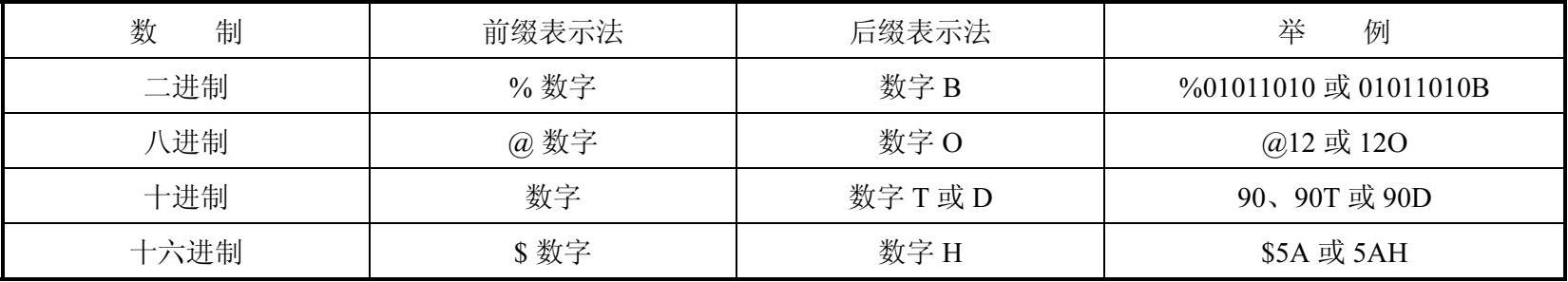 在HCS08 系列指令系统中可以使用二进制、八进制、十进制、十六进制这 4 种数制,并采用表 3-1 中规定的几种表示法。对于无前后缀符号数值,大多数编译器默认为十进制数,但是P&E公司的编译器默认把没有前缀的数字当成十六进制数来处理。本书中使用的Codewarrior软件默认没有前缀的数字为十进制数。