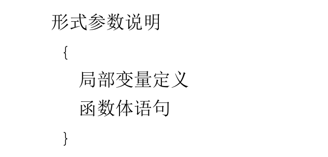 这里定义了一个返回值为整型值的函数power(),它有两个形式参数:x,n。形式参数的作用是接受从主调用函数传递过来的实际参数的值。上例中形式参数x和n被说明为int类型。花括号以内的部分是自定义函数的函数体。上例中在函数体内定义了两个局部变量i和p,它们均为整型数据。