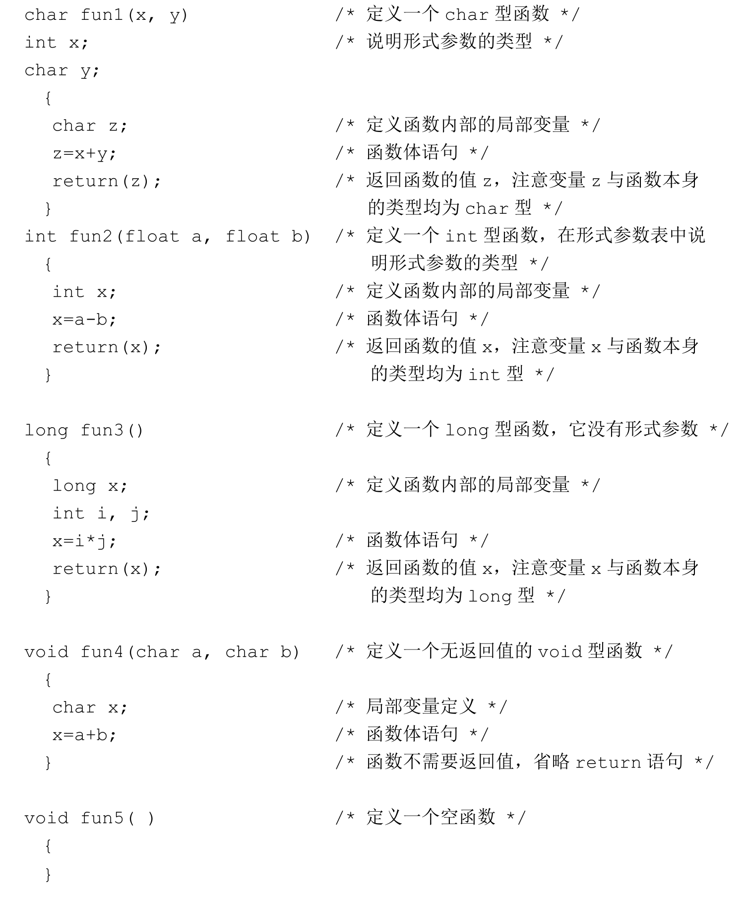 由于p是函数的返回值,因此在函数体中进行变量定义时,应将变量p的类型定义得与函数本身的类型相一致。如果两者类型不一致,则函数调用时的返回值可能发生错误。如果函数体中没有return语句,则该函数由函数体最后面的右闭花括号“}”返回。在这种情况下,函数的返回值是不确定的。