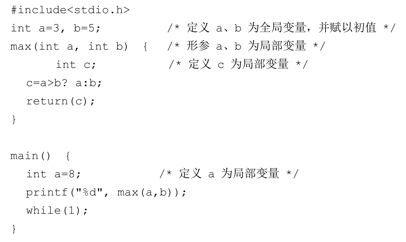 第二行开始是定义一个求最大值函数max(),其作用是求得a和b中较大者的值。这里的a和b是max()函数的形式参数,属于局部变量。外部变量a和b在函数max()内部不起作用,即形式参数a和b的值不再是3和5,它们的值是通过主调函数中的实际参数传递过来的。
