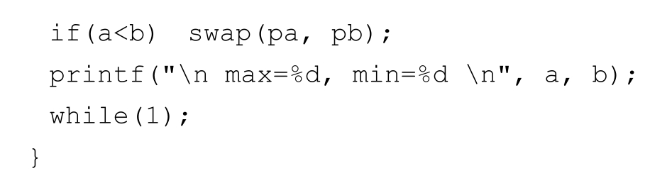 程序中自定义函数swap()的功能是交换两个变量a和b的值,swap()函数的两个形式参数p1和p2是指针变量。程序开始执行时,先输入a和b的值,然后将a和b的地址分别赋给指针变量pa和pb,使pa指向a,pb指向b。接着执行if语句,如果a<b则调用swap()函数。