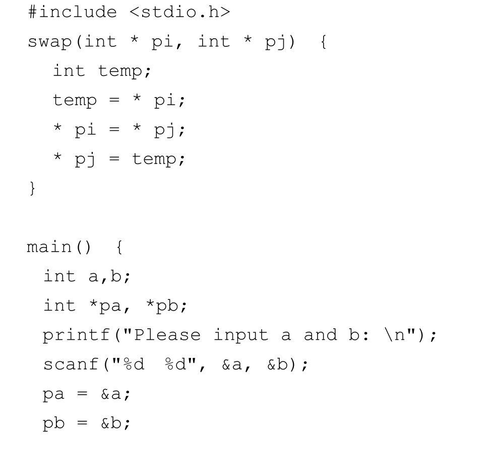 注意函数调用时的实参pa和pb也是指针变量,调用开始时,实参变量将它的值传递给形参变量,采取的仍然是“值传递”方式,但这时传递的是指针的值(即地址)。参数传递完成后,形参pi的值为&a,pj的值为&b,即指针变量*pi和*pa都指向了变量a,*pj和*pb都指向了变量b。接着执行swap()函数体,使*pi和*pj的值互换,从而实现了a和b值的互换。函数返回时,虽然pi和pj被释放而不再存在,但main()函数中a和b的值已经被交换,因此最后能输出正确的结果。