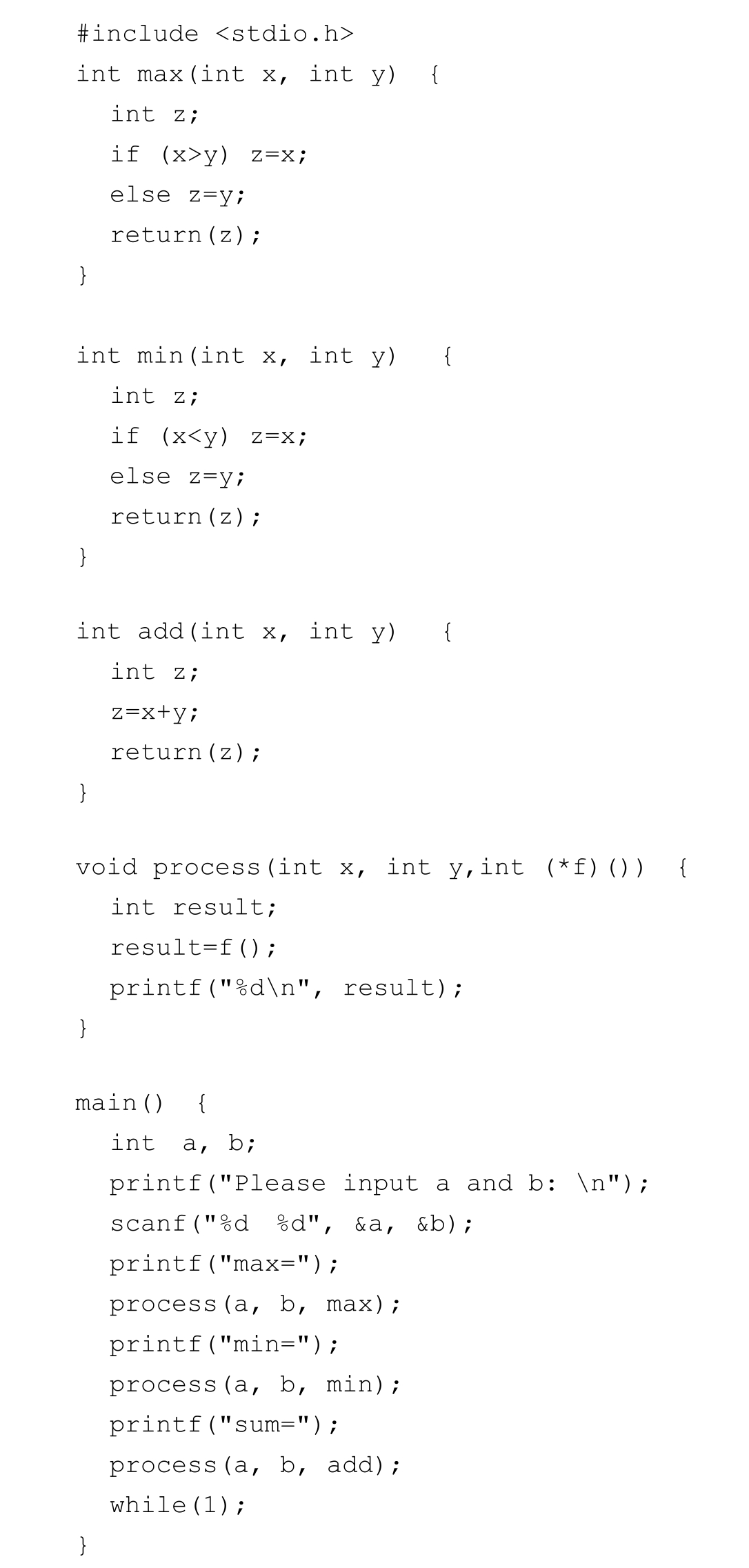 本例中三个函数max()、min()和add()分别用来实现求较大数、求较小数和求和的功能。在主函数main()中第一次调用process()函数时,除了将a和b作为实参传递给process()的形参x、y之外,还将函数名max作为实参(入口地址)传递给process()的形参——指向函数的指针变量*f。这样一来,process()中的函数调用语句 result=f();就相当于result=max(x,y);执行process()函数即可求出a与b中的较大者。第二次调用process()函数时改用函数名min作为实参,第三次调用process()函数时改用函数名add作为实参,从而实现每次调用process()函数时完成不同的功能。