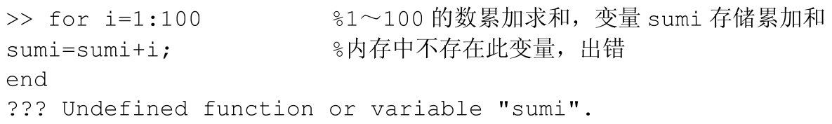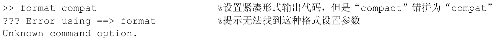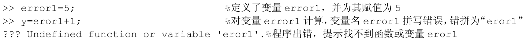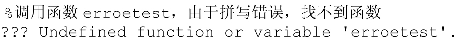 这类错误主要涉及函数名或者变量名拼写错误,MATLAB运行后会提示找不到变量或函数的错误信息;MATLAB中的一些函数需要设置固定的参数,其中参数的关键词如果拼写错误,就会提示找不到这个参数;另外一些MATLAB固定的关键字、流程控制语言,也会由于一时大意拼写出错,无法执行代码。但是一般MATLAB的关键词都会以一定颜色突出显示,当输入关键字后颜色与一般代码一样,就需要检查是否有拼写错误。同时MATLAB的命令是区分大小写的。一般情况下MATLAB自带的函数、命令都为小写状态,如果输入大写状态,则执行不了相应的任务。