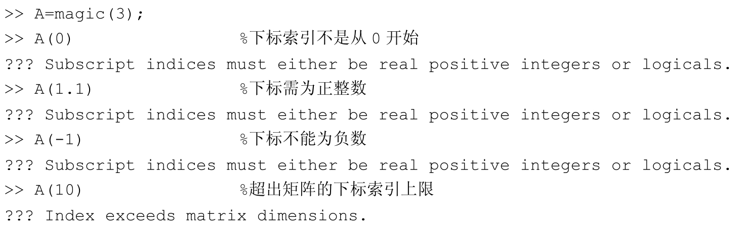 在通过下标访问矩阵、数组、向量中的元素时,容易出错的几个地方:超出下标的范围,下标索引从1开始而不是0,且下标索引不能为负数,需要为正整数。